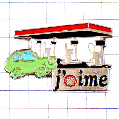ピンバッジ・ガススタンドに入る緑の車シェル石油 SHELL ENGLAND