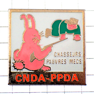 ピンバッジ・ピンク色のウサギ兎ハンティング狩猟ハンターを狙うライフル銃