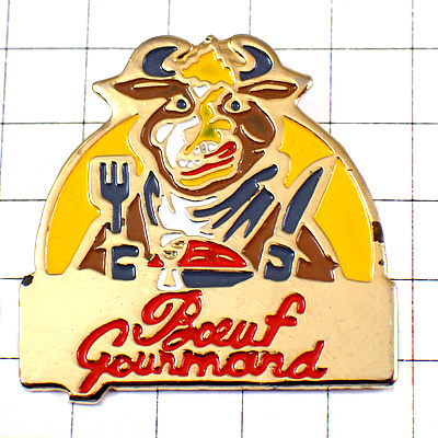 ピンバッジ・グルメな牛ウシお客さんナイフとフォーク