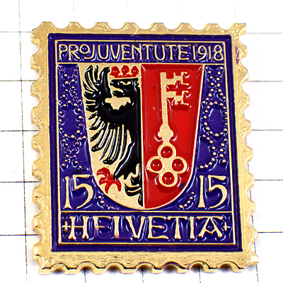 ピンバッジ・鷲イーグル黄色いカギ鍵ジュネーブ紋章スイス鳥ラポスト郵便切手型 GENEVE SWISS COAT-OF-ARMS STAMP