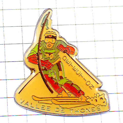 ピンバッジ・旗を倒すスキーヤー滑降中