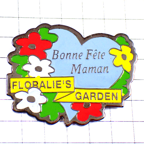 ピンバッジ・花に囲まれた青いハート母の日 BONNE-FETE-MAMAN FRANCE