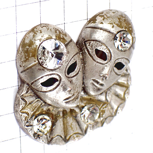 ピンバッジ・仮面ピエロ道化師カーニバルのマスク2つ銀色ピューター製ラインストーン PIERROT COLOMBINE