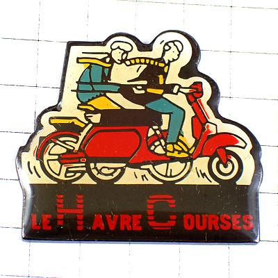 ピンバッジ・赤いスクーター二輪バイク2台オートバイ黄色いマフラー二人