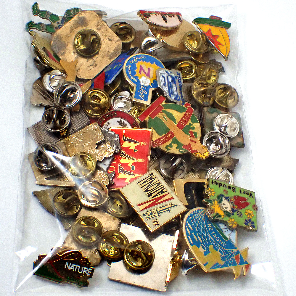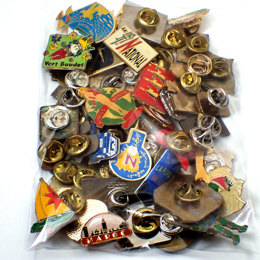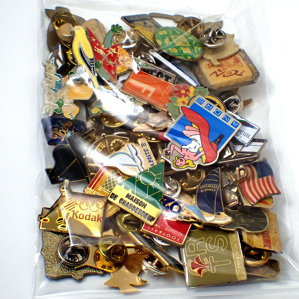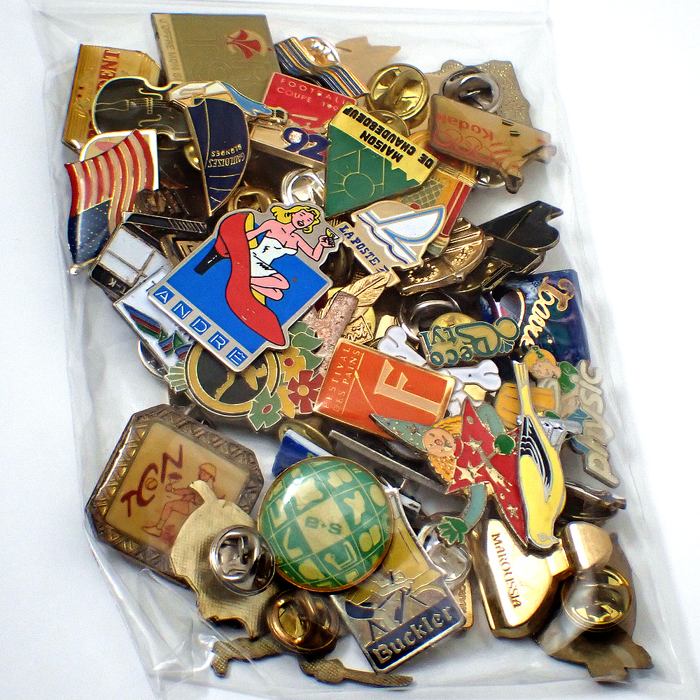 フランス ピンズ 雑貨 ヴィンテージ ピンバッジまとめて50個セット まとめ売り 大量 フレンチ ビンテージ 広告 ハイヒール船ロバ国旗ピアノ香水モロッコ女の子など