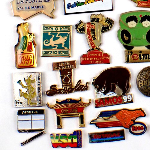 フランス ピンズ 雑貨 ヴィンテージ ピンバッジまとめて50個セット まとめ売り 大量 フレンチ ビンテージ 広告 スキー熊パレット映画カチンコ虎コニカ帆船など