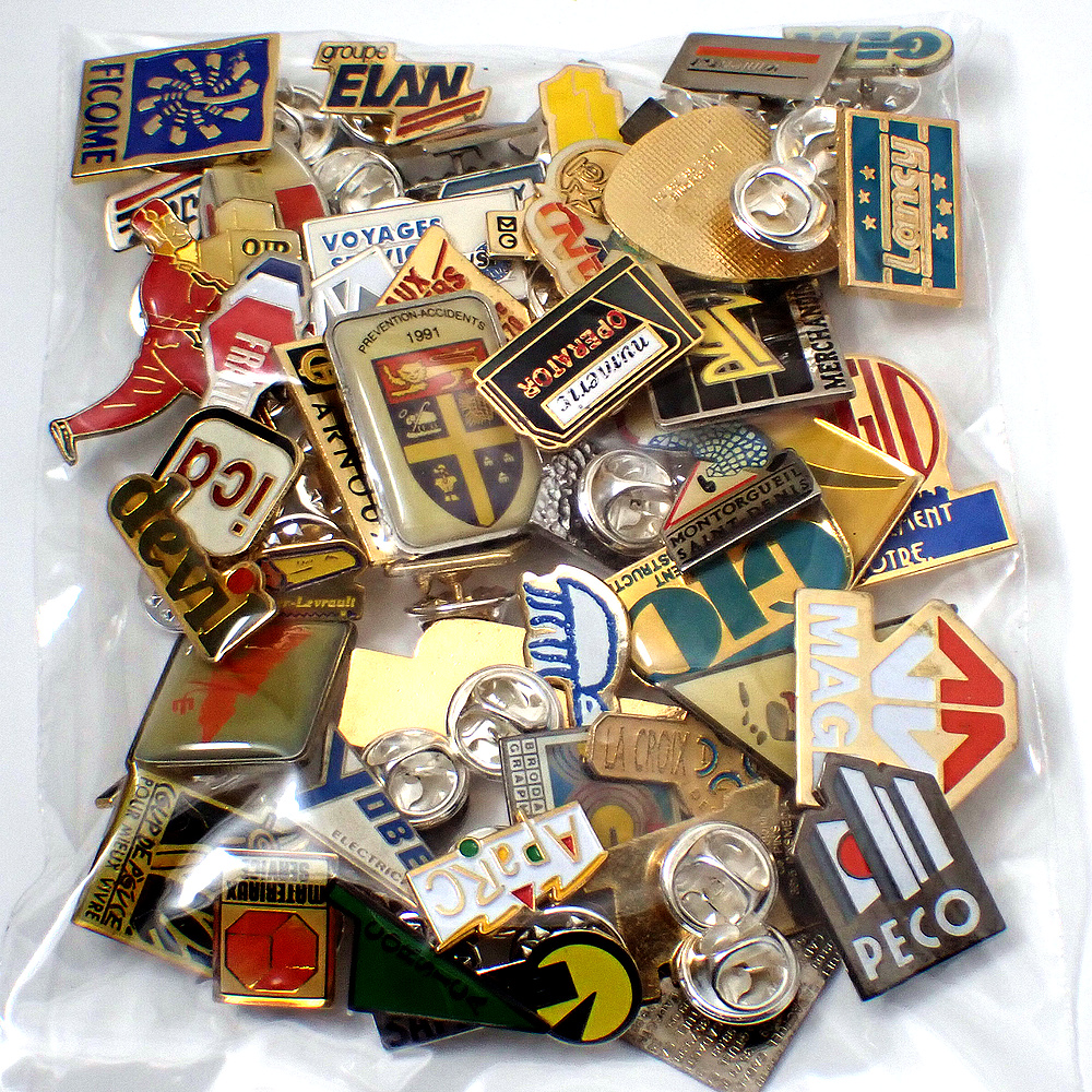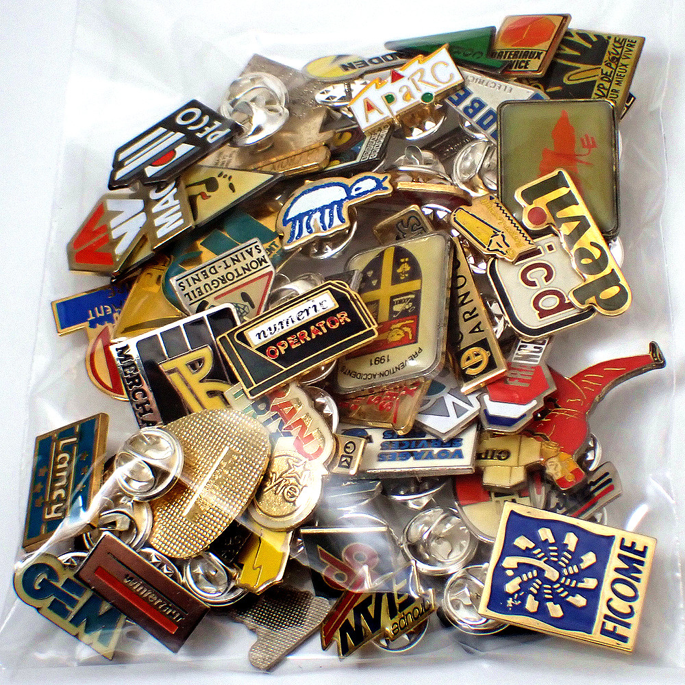 フランス ピンズ 雑貨 ヴィンテージ ピンバッジまとめて50個セット まとめ売り 大量 フレンチ ビンテージ 広告 ポーター受話器アベピエール神父ライオン紋章自転車虫など